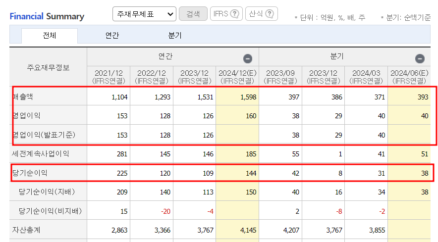 매출액, 영업이익, 당기순이익을 보면 2023년까지 줄어들다가 2024년 이번에 기대치가 높은 걸까욤? 벌써 나오나?