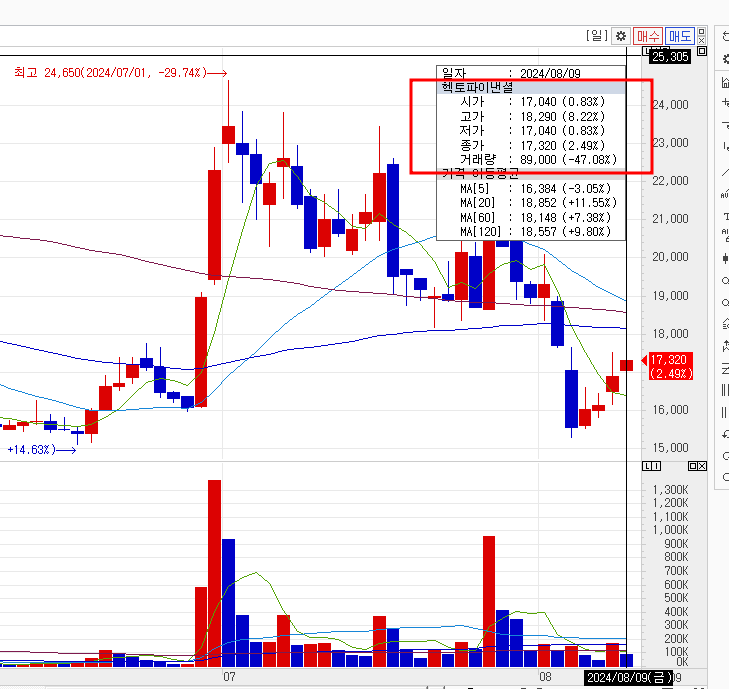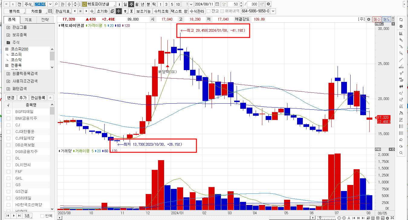 판돈이 크지 않아서 일지도 모르겠습니다. 헥토파이낸셜 차트를 보니 8월 5일 이후로 슬금 슬금 올라오고 있습니다.