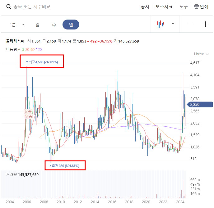 2004년 부터 차트를 보니.. 거래량은 안보이는데... 최고 4,583원, 최저 360원. 아오... 후덜덜한데요.